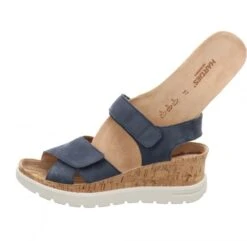 Sommerliche Keilsandale des österreichischen Herstellers Hartjes in Weite H. Das Obermaterial besteht aus weichem Veloursleder. Für das Innenfutter wurde bestes Glattleder verwendet. Die mit Leder überzogene Korksohle ist austauschbar. Für Ihren persönlichen Gehkomfort können Sie Ihre eigenen orthopädischen Einlagen verwenden. Dank der beiden stufenlos verstellbaren komfortabel breiten Klettriemen lässt sich dieser feminine Schuh perfekt an Ihren Fuß anpassen. Die Laufsohle in Kontrastfarbe ist extra dick, rutschhemmend, elastisch und flexibel. Die Absatzhöhe beträgt 6 cm. Eine schöne und bequeme Sandale die vielseitig kombinierbar ist und perfekt für warme Tage!