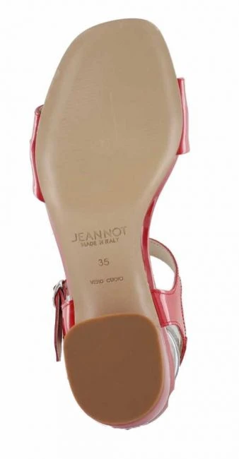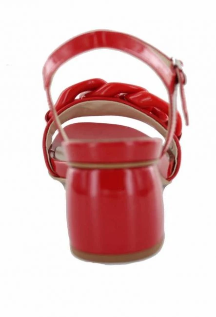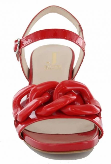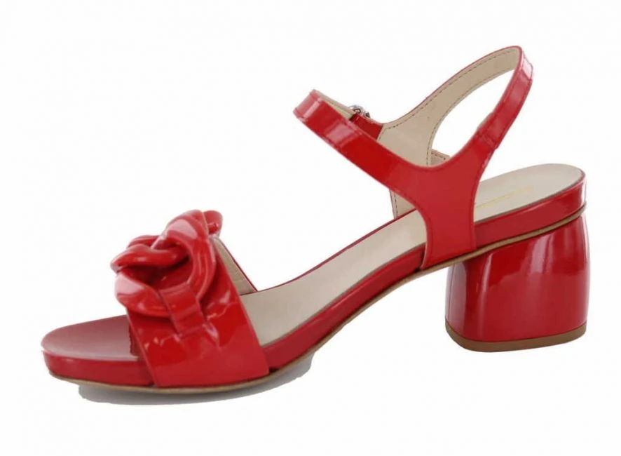 Rote Sandalette aus einer Kombination von Lack und Kalbsleder. Dieser italienischer Schuh von Jeannot verleitet ein komfortables Tragegefühl mit einem Blockabsatz von 4,5cm, Die Kettenapplikation rundet den femininen Ton ab. Fester Halt durch das verstellbare Riemchen.