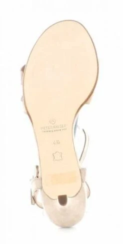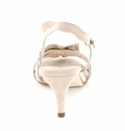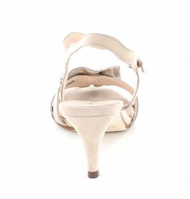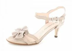Edle Sandale in sand mit weichen Velourlederriemchen und einer Blume mit Swarovskisteinen. Lederdecksohle und Lederlaufsohle.