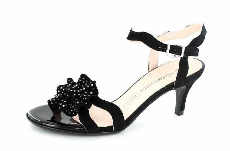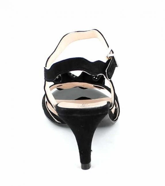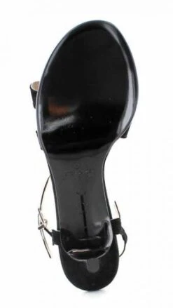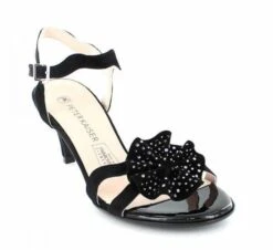 Edle Sandale in schwarz mit weichen Velourlederriemchen und einer Blume mite Swarovskisteinen. Lederdecksohle und Lederlaufsohle.