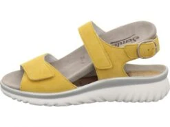 Modische und sehr bequeme Sandale aus weichem Veloursleder in bequemer Weite H. Herausnehmbares, lederbezogenes Fußbett zum Tragen von orthopädischen Einlagen. 25 mm Keilabsatz sorgt für guten Stand. Klettverschlüsse zum perfekten Anpassen an den Fuß. Flexible PU-Luftpolstersohle reduziert harte Auftrittstöße. Ideale Sandale für den täglichen Gebrauch oder für die Freizeit.