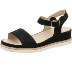 Sandale von SIOUX aus Ziegenveloursleder mit einem Riemchen aus geprägtem Ziegenveloursleder in Flecht-Optik sowie einem verstellbaren Riemchen mit Druckknopf und Schließe, unter der sich ein elastischer Einsatz befindet.