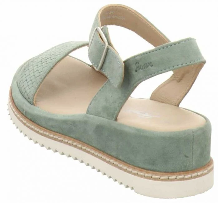 Sandale von SIOUX aus Ziegenveloursleder mit einem Riemchen aus geprägtem Ziegenveloursleder in Flecht-Optik sowie einem verstellbaren Riemchen mit Druckknopf und Schließe, unter der sich ein elastischer Einsatz befindet.